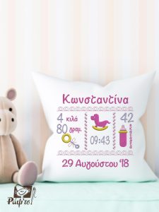 Κεντημένο Μαξιλαράκι για κορίτσι – (Όνομα, ώρα, ύψος, κιλά, γραμμάρια, ημερομηνία γέννησης)
