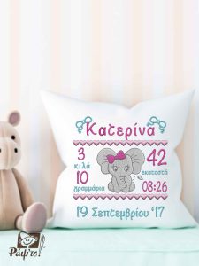 Κεντημένο Μαξιλαράκι για κορίτσι – Ελεφαντάκι – (Όνομα, ώρα, ύψος, κιλά, γραμμάρια, ημερομηνία γέννησης)